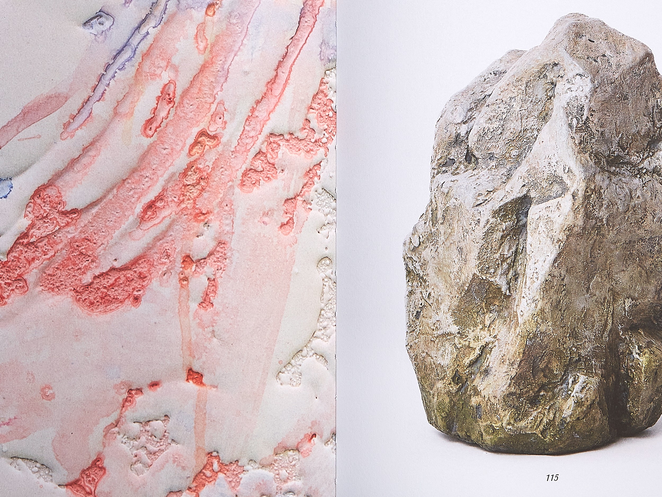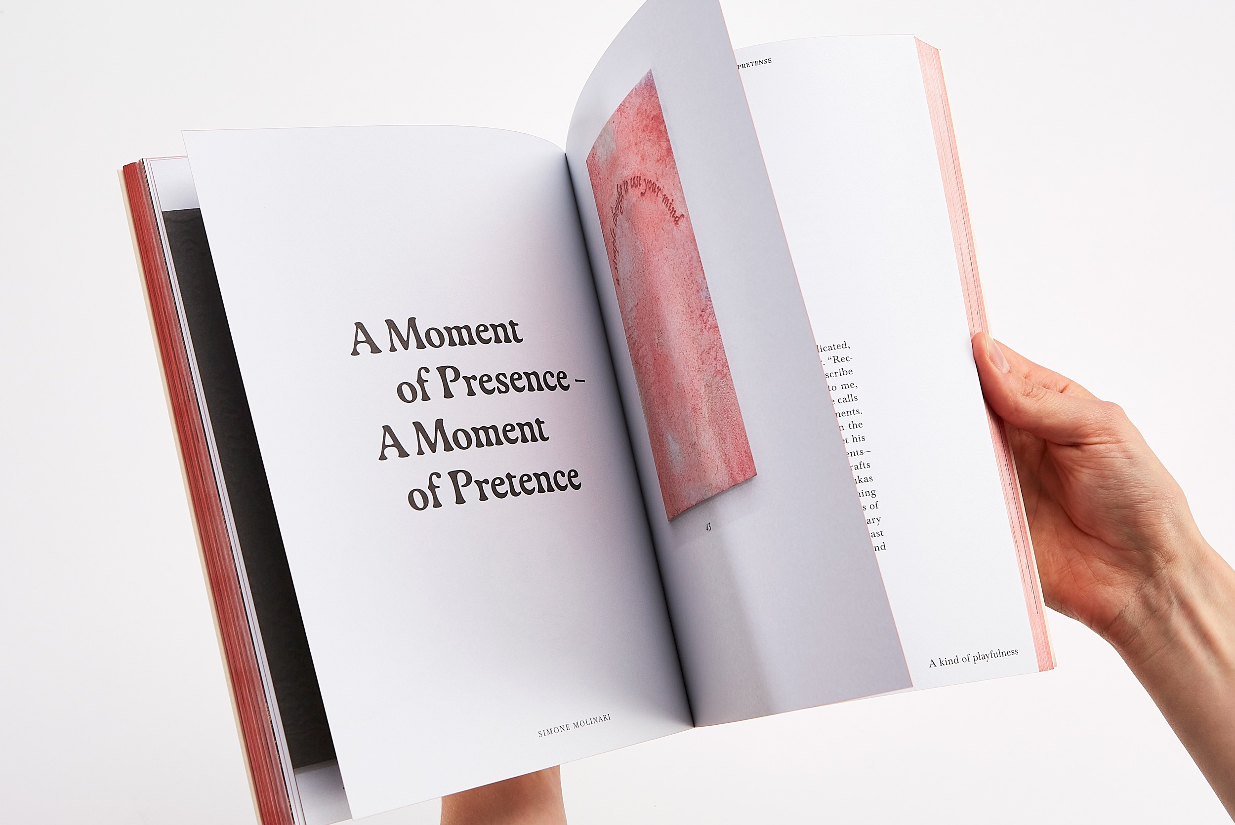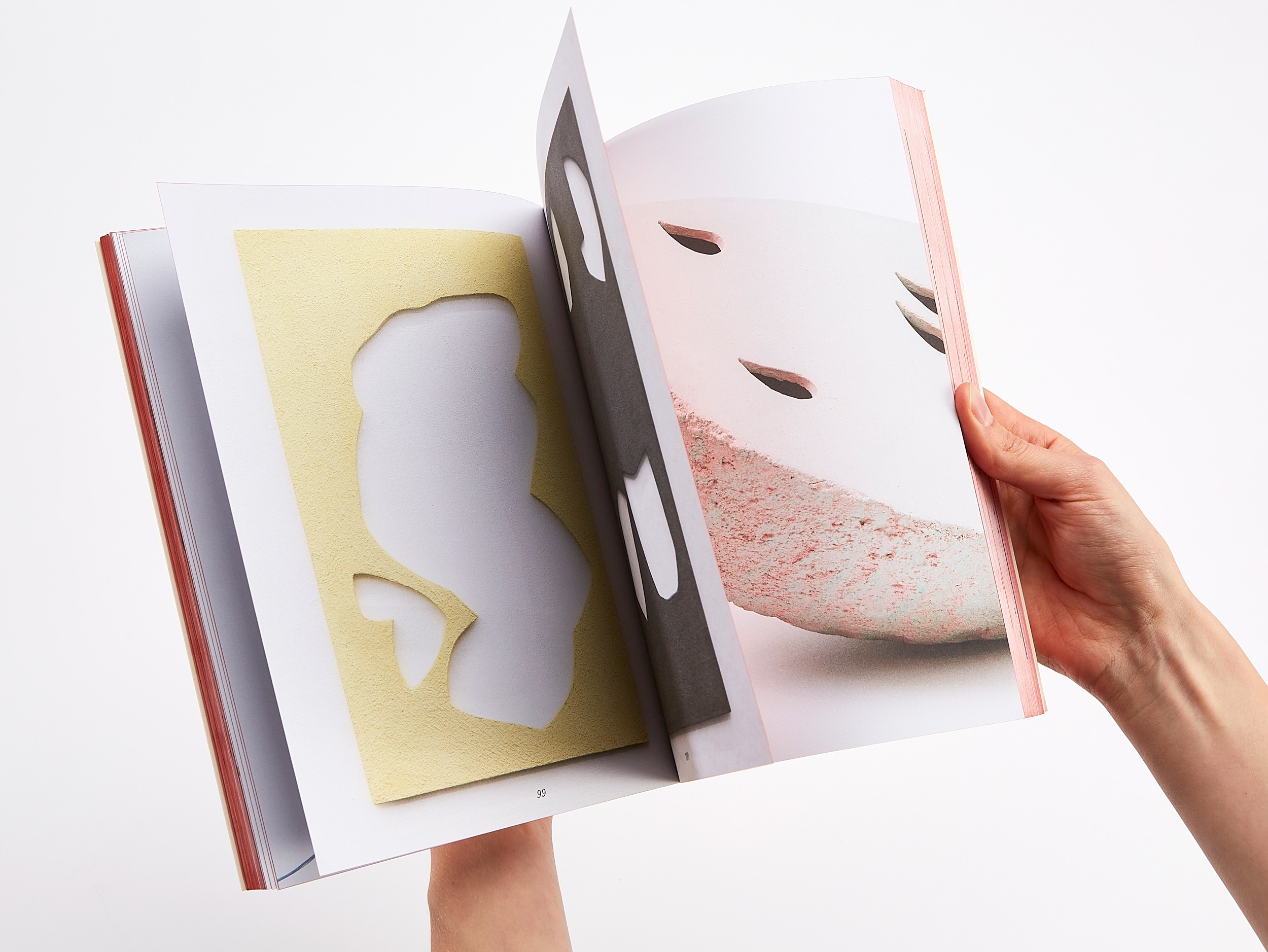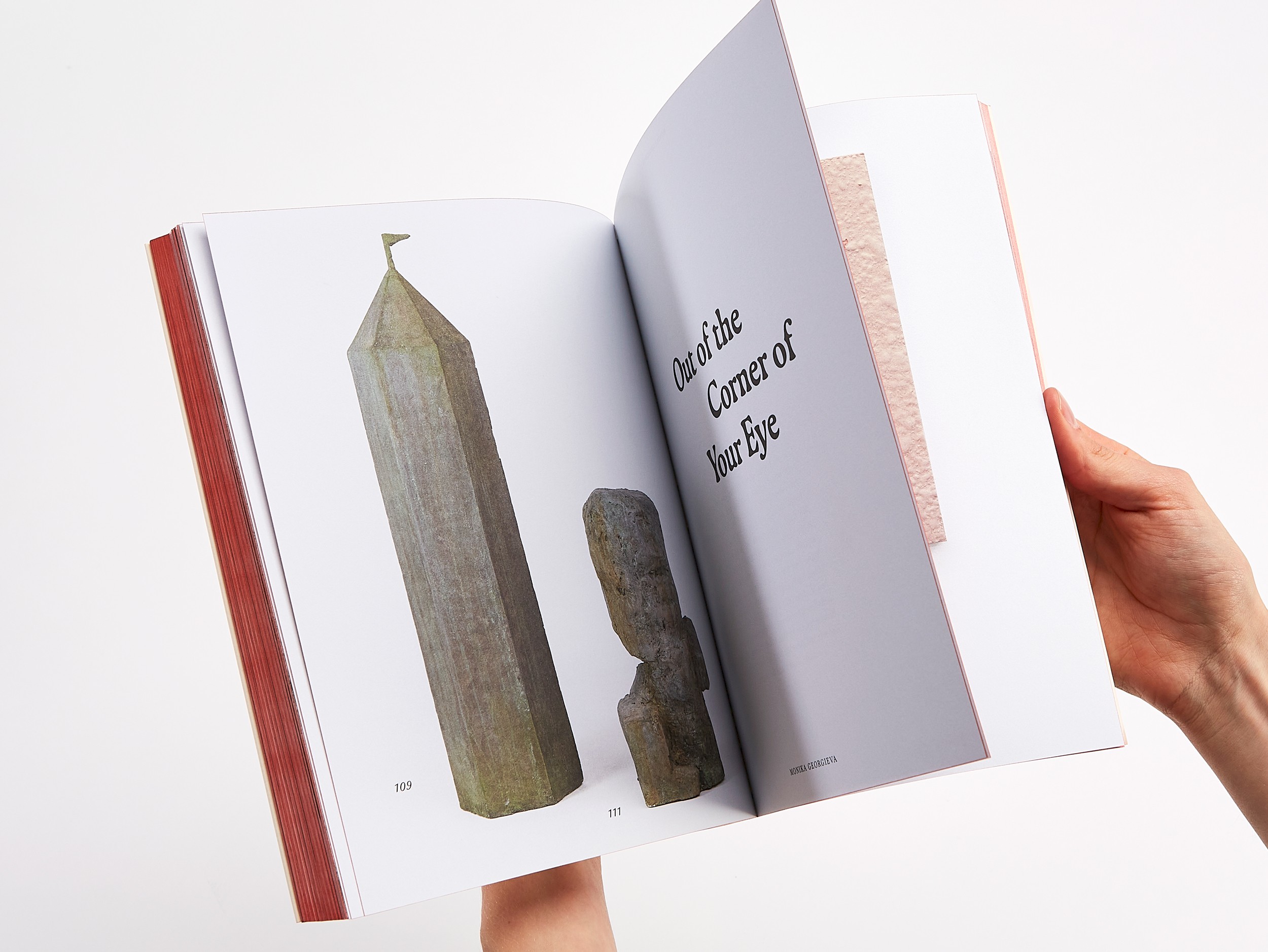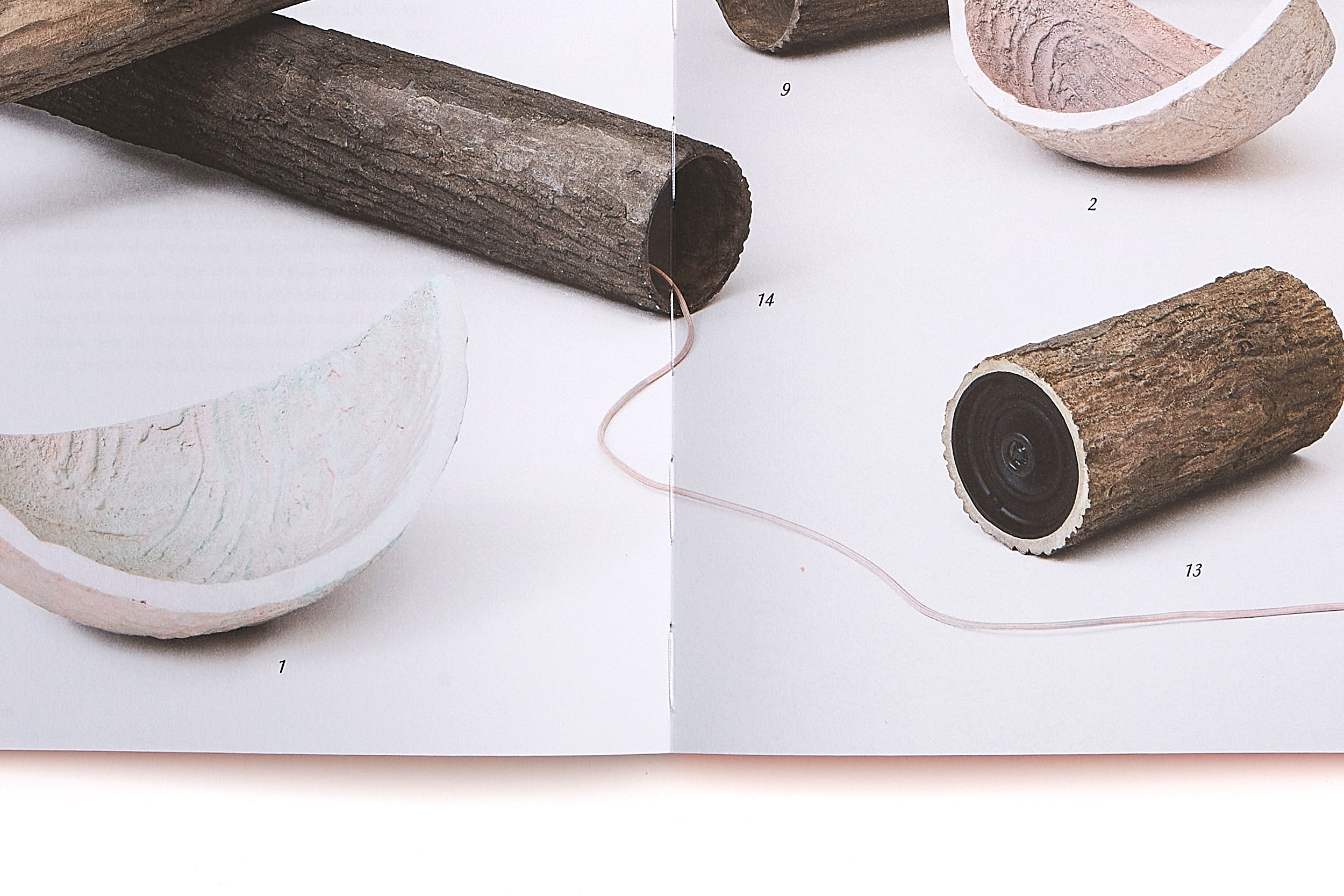 In the book’s core, no paper color is visible. All elements (objects and texts) appear against the background of a white exhibition wall in an undefined space. The bilingual texts weave their way through the exhibition, printed on a rough, uncoated paper.
