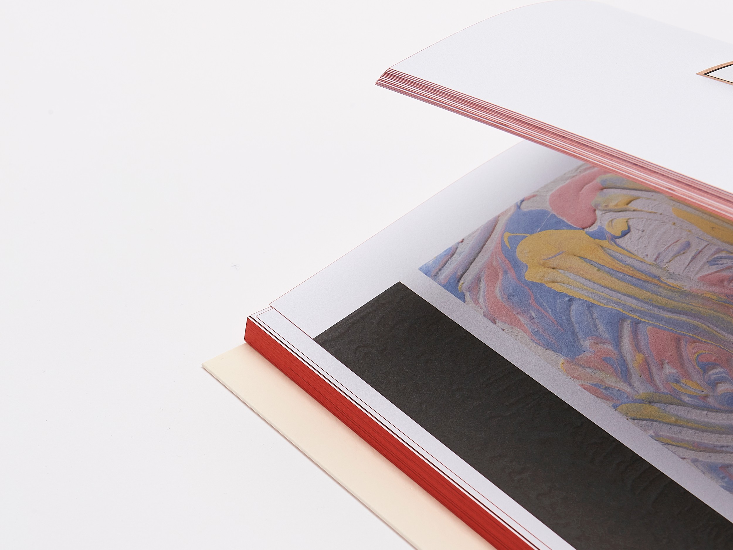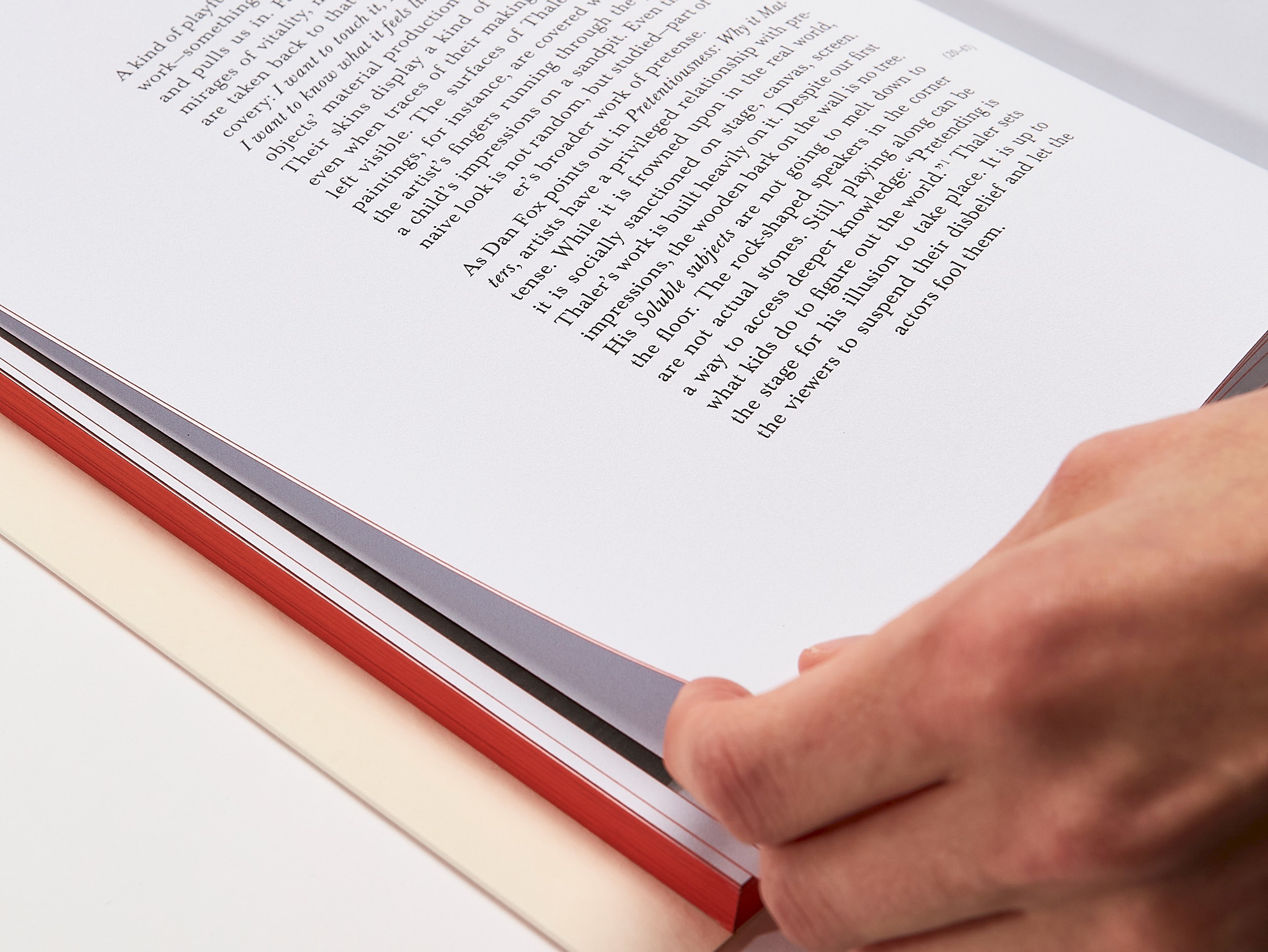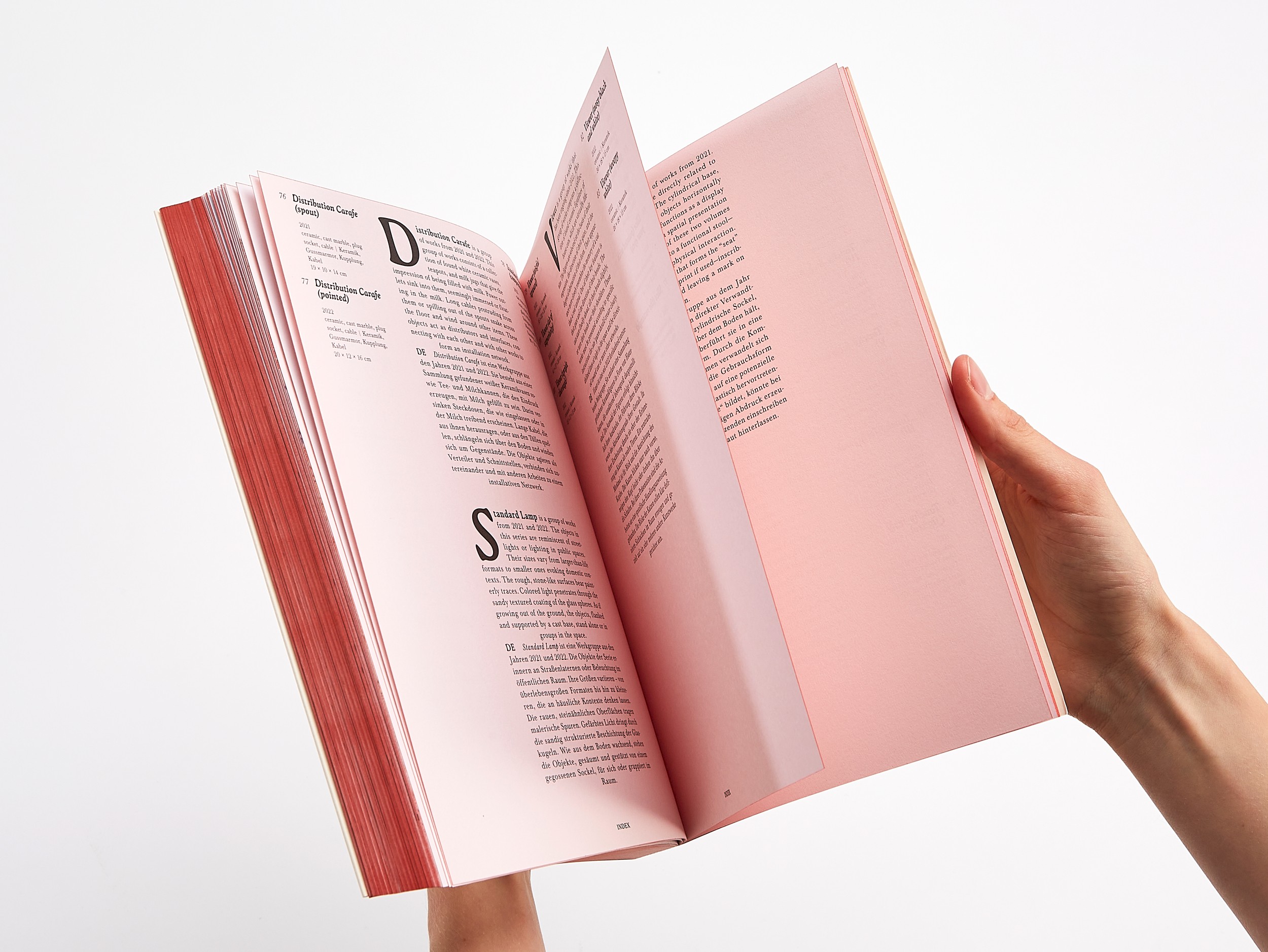 The red fore-edge refers to the glow or radiance of Thaler’s works. Depending on how the pages are fanned, the hue shifts; similarly, the intensity of the red tone on the index pages varies in subtle ways.
