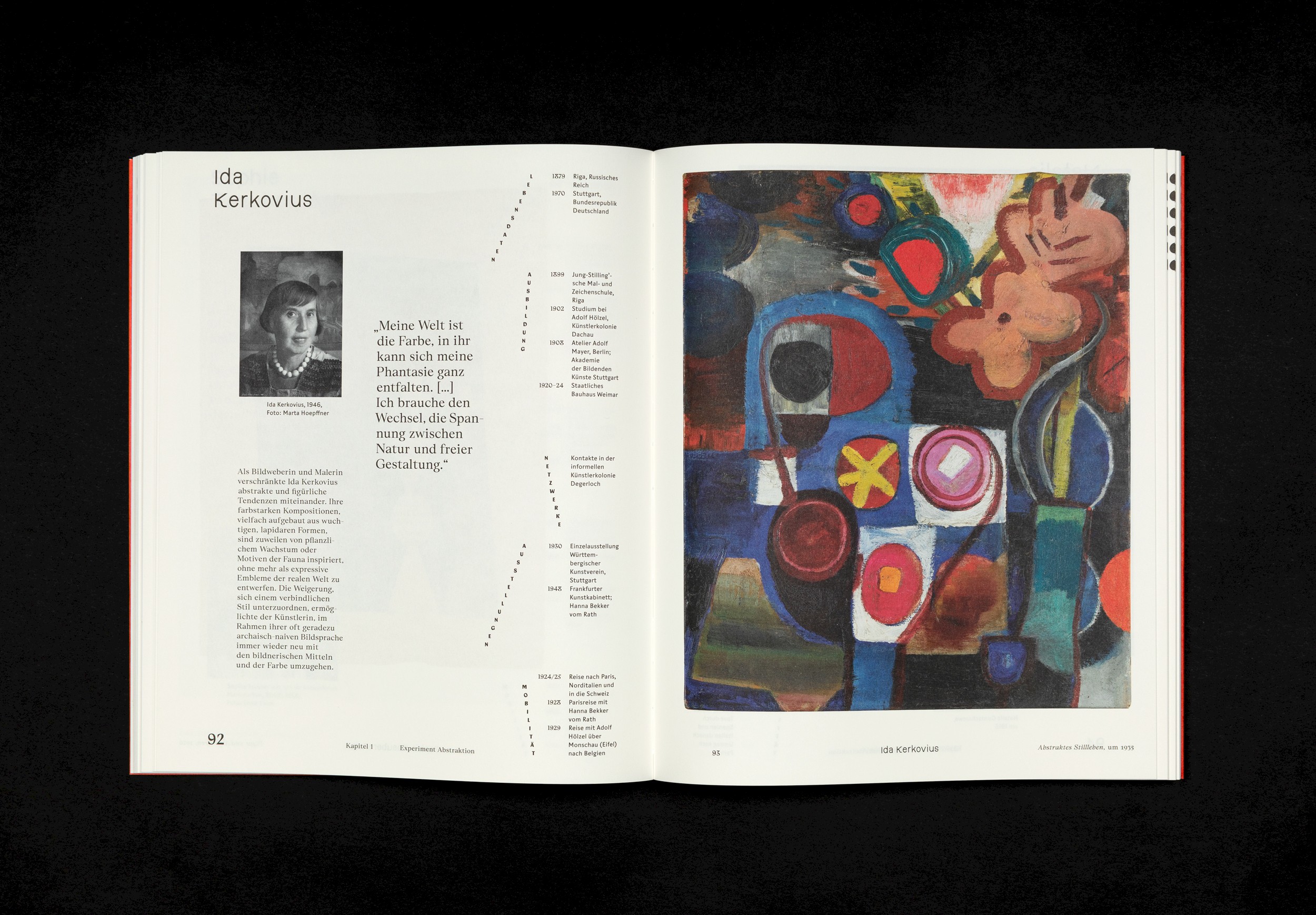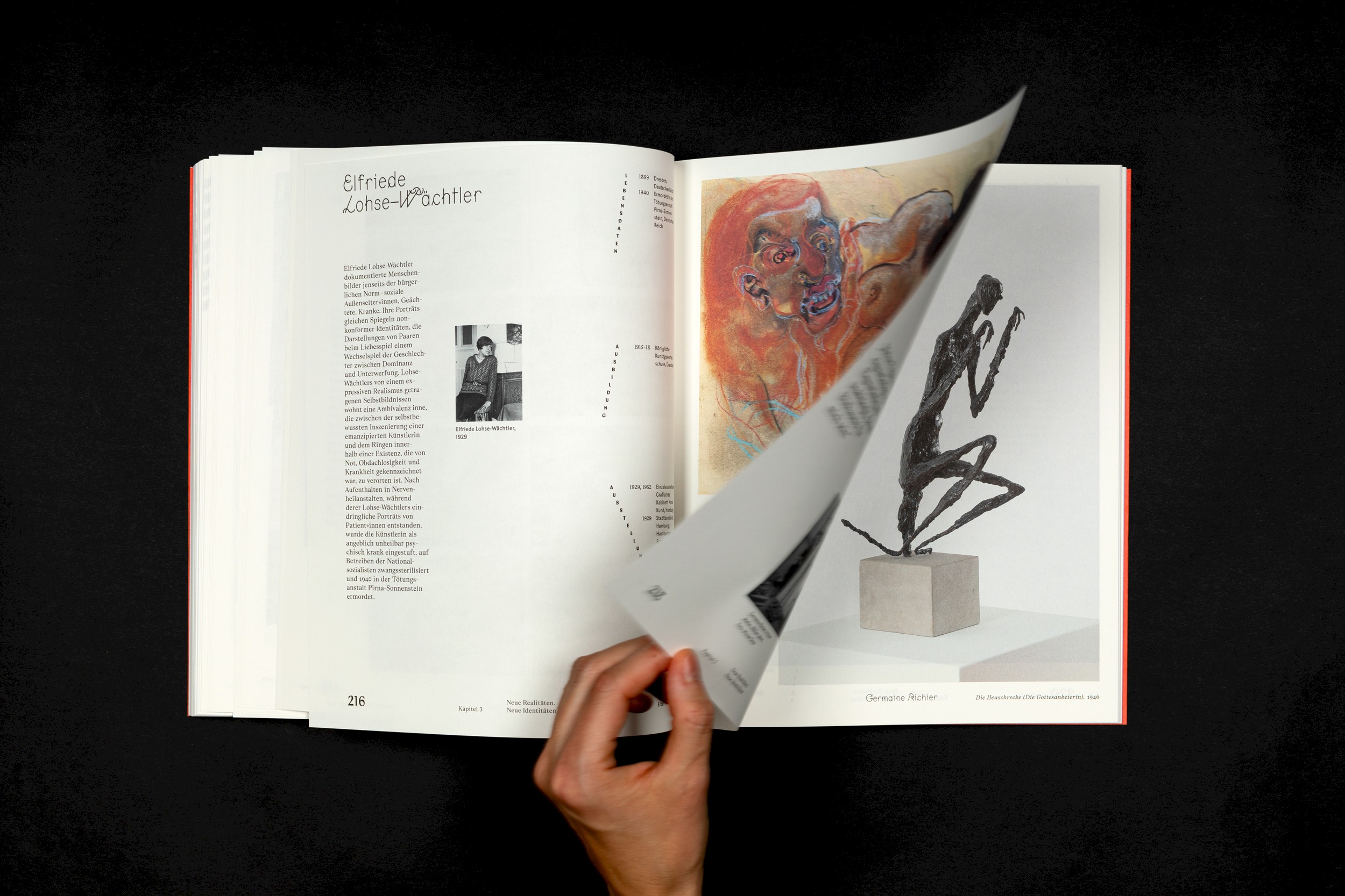 The catalogue pursues a non-linear presentation of art history that is global and multi-perspectival. The use of outdents instead of indents, diagonally set headings, and the chapter-by-chapter migration of text blocks from the right edge of the page toward the left is intended to suggest a break from the art-historical canon.