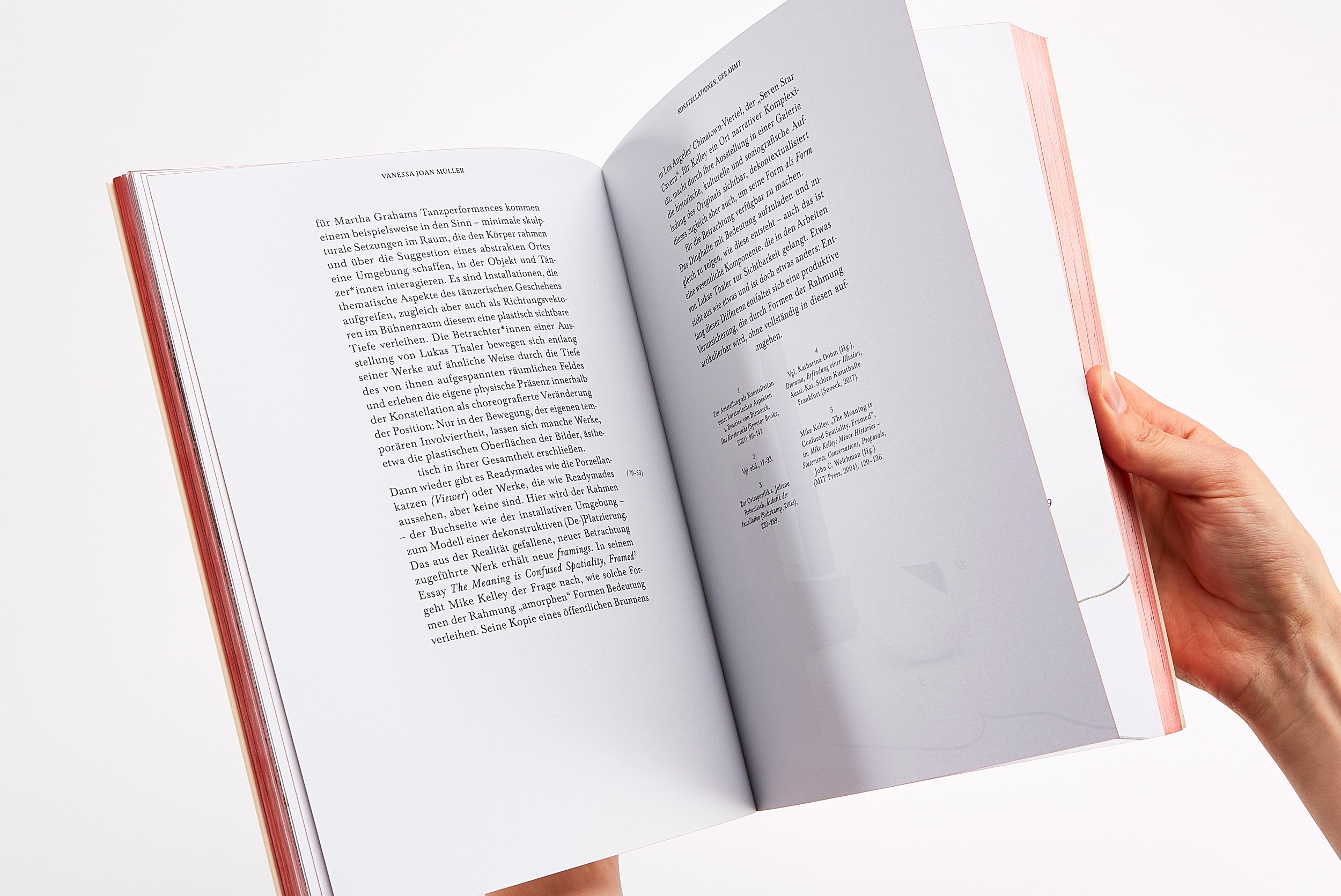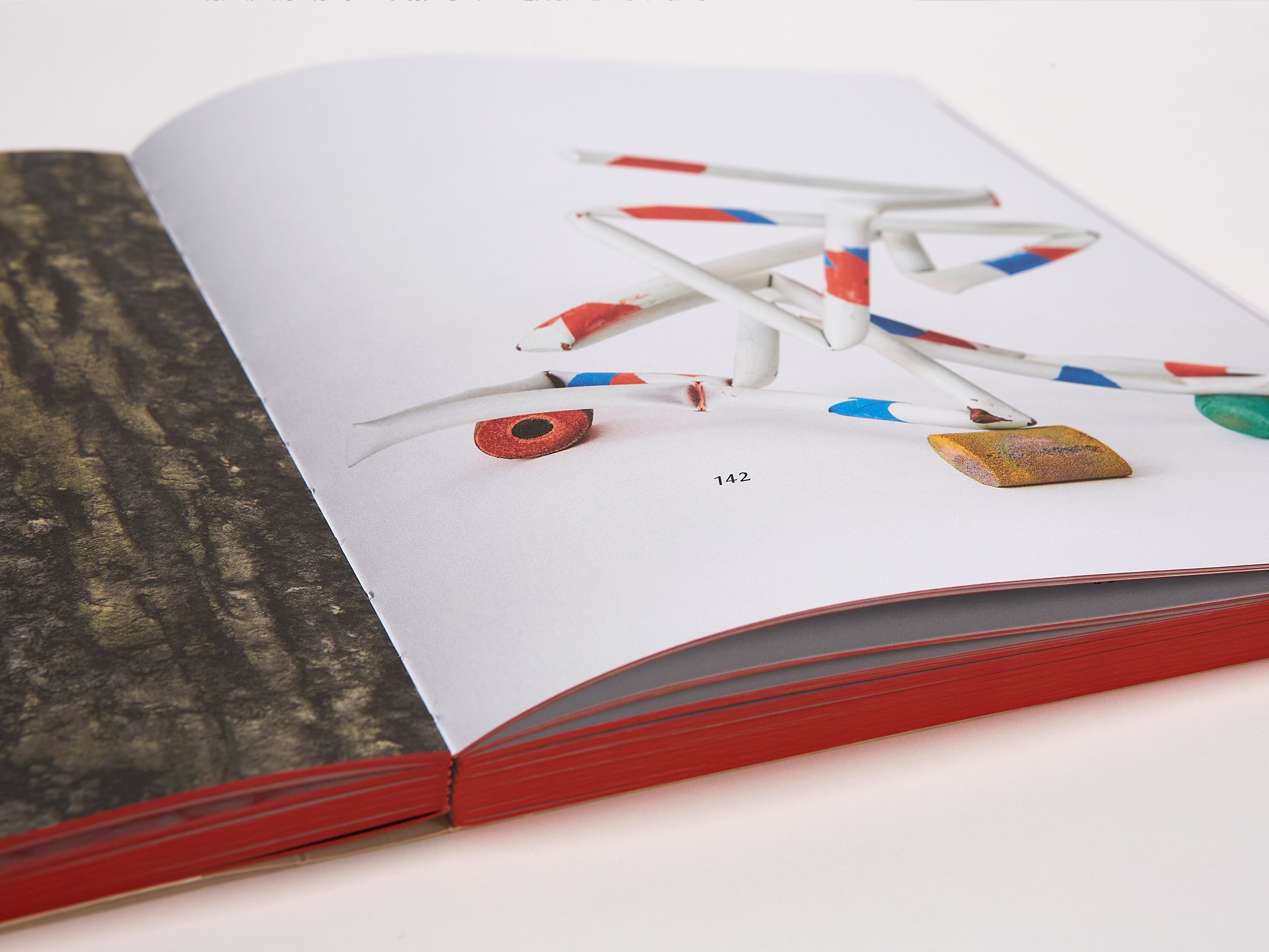 In the book’s core, no paper color is visible. All elements (objects and texts) appear against the background of a white exhibition wall in an undefined space. The bilingual texts weave their way through the exhibition, printed on a rough, uncoated paper.