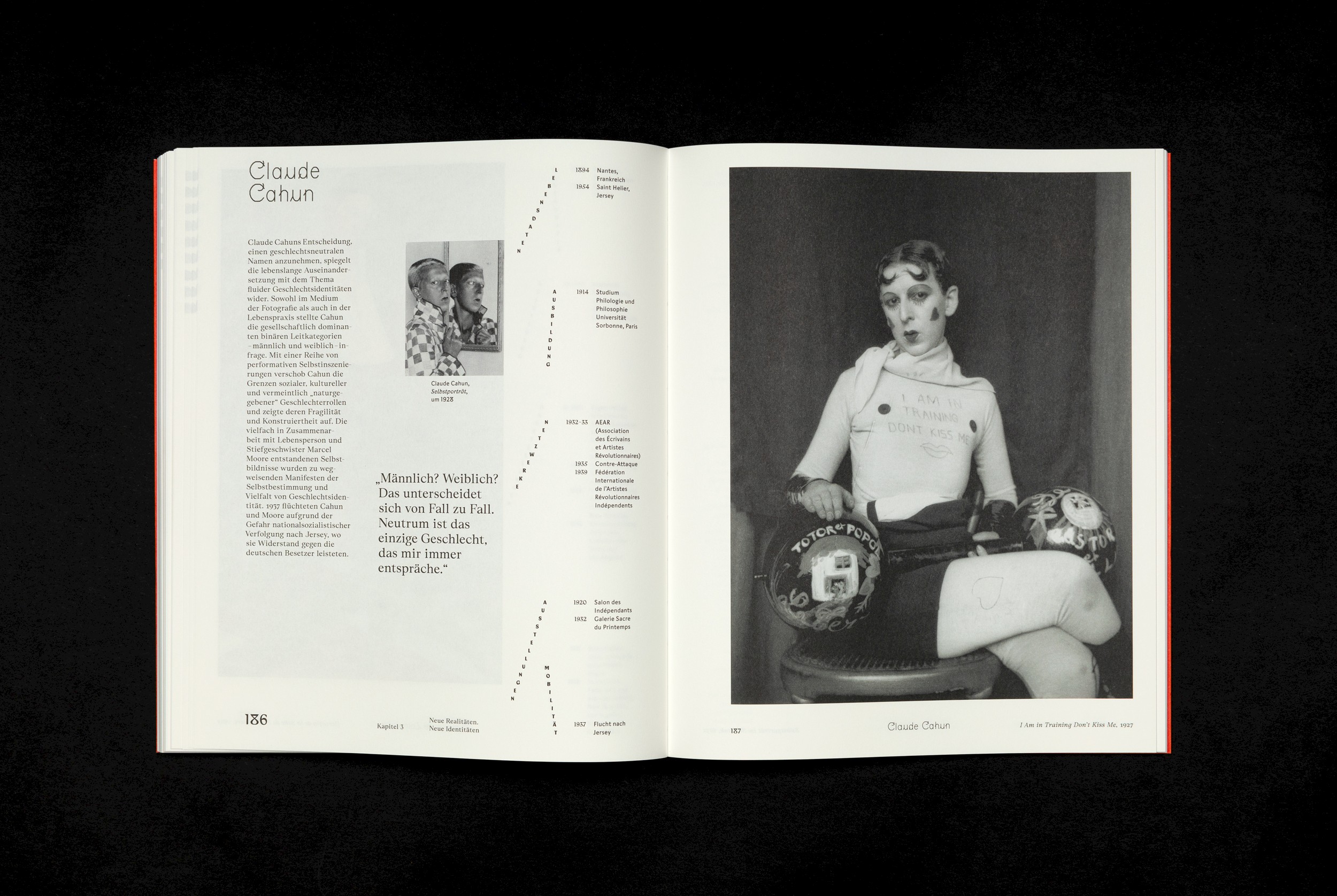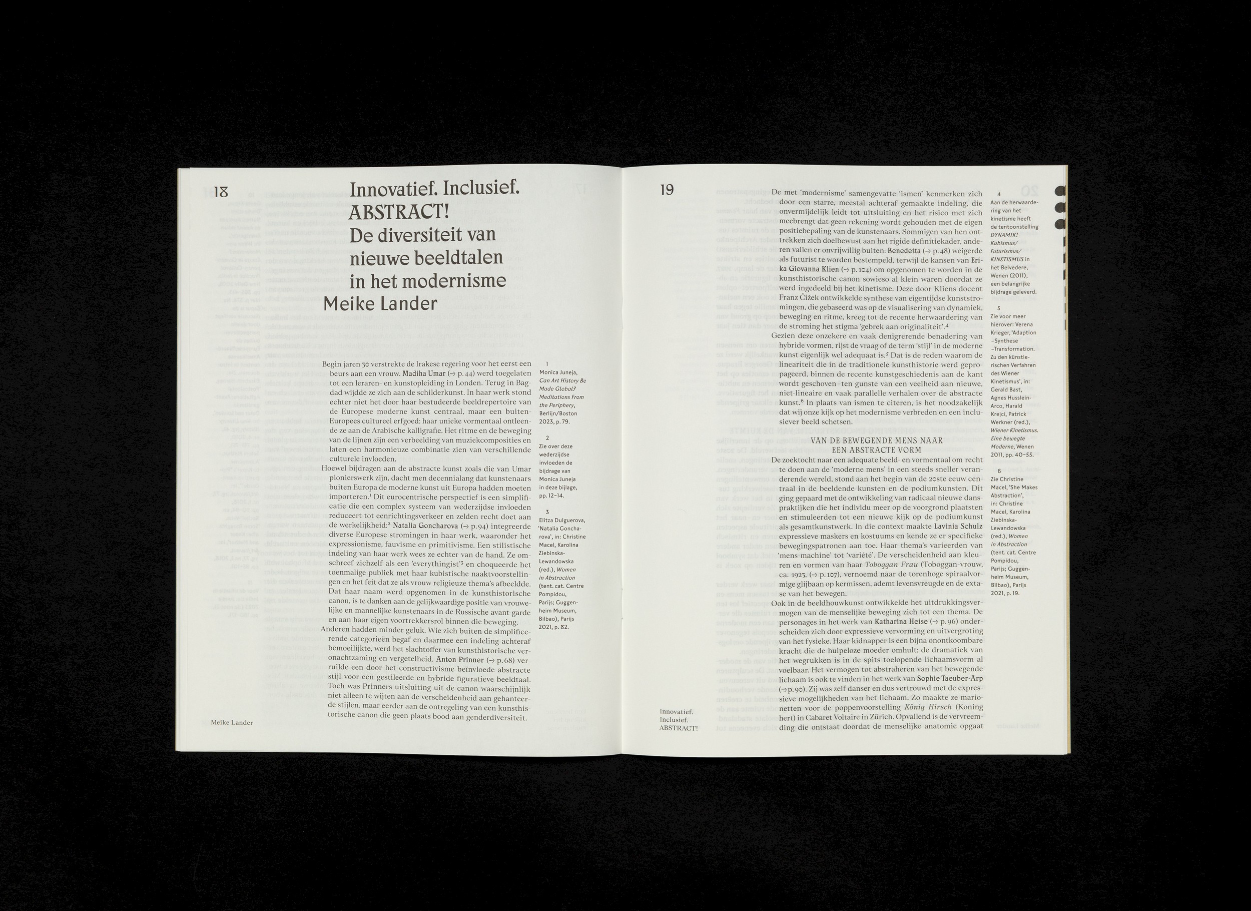 The catalogue pursues a non-linear presentation of art history that is global and multi-perspectival. The use of outdents instead of indents, diagonally set headings, and the chapter-by-chapter migration of text blocks from the right edge of the page toward the left is intended to suggest a break from the art-historical canon.