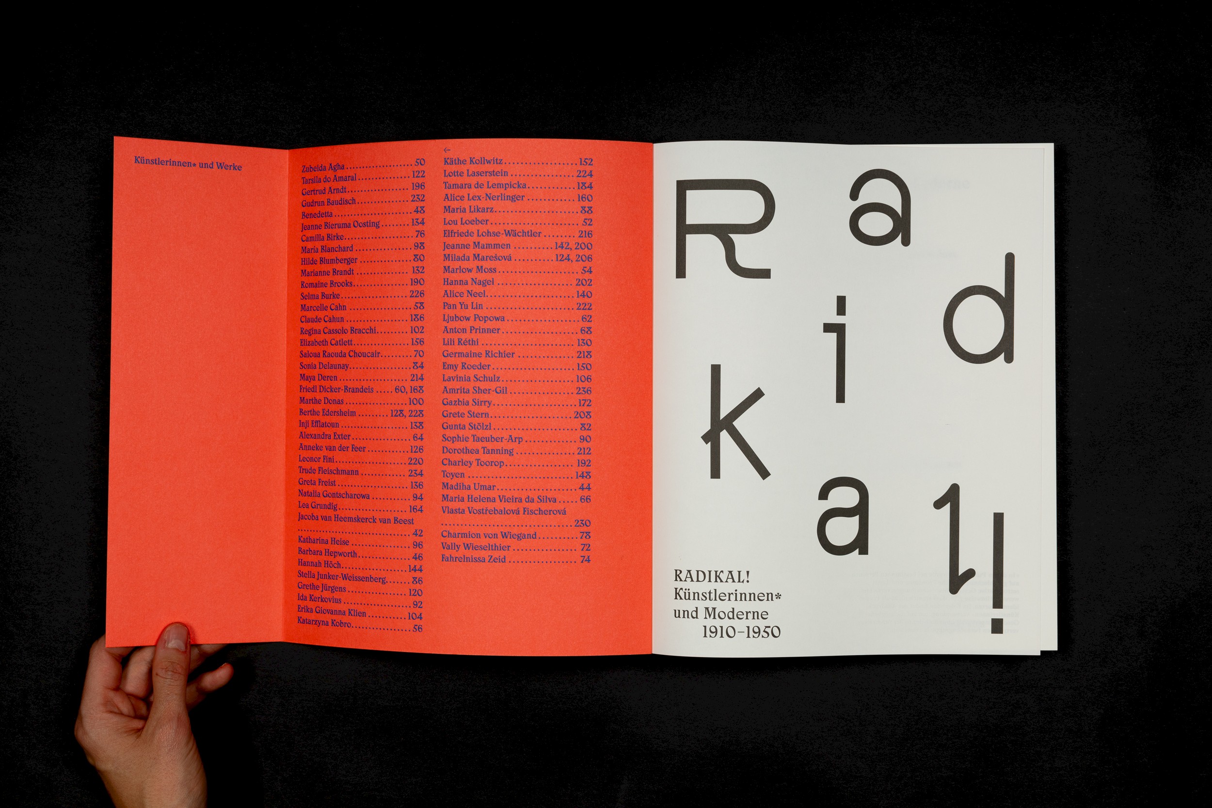 Central to the design concept was the visibility of the women* artists: their names are set in eccentric typefaces and are typographically highlighted within the body text.