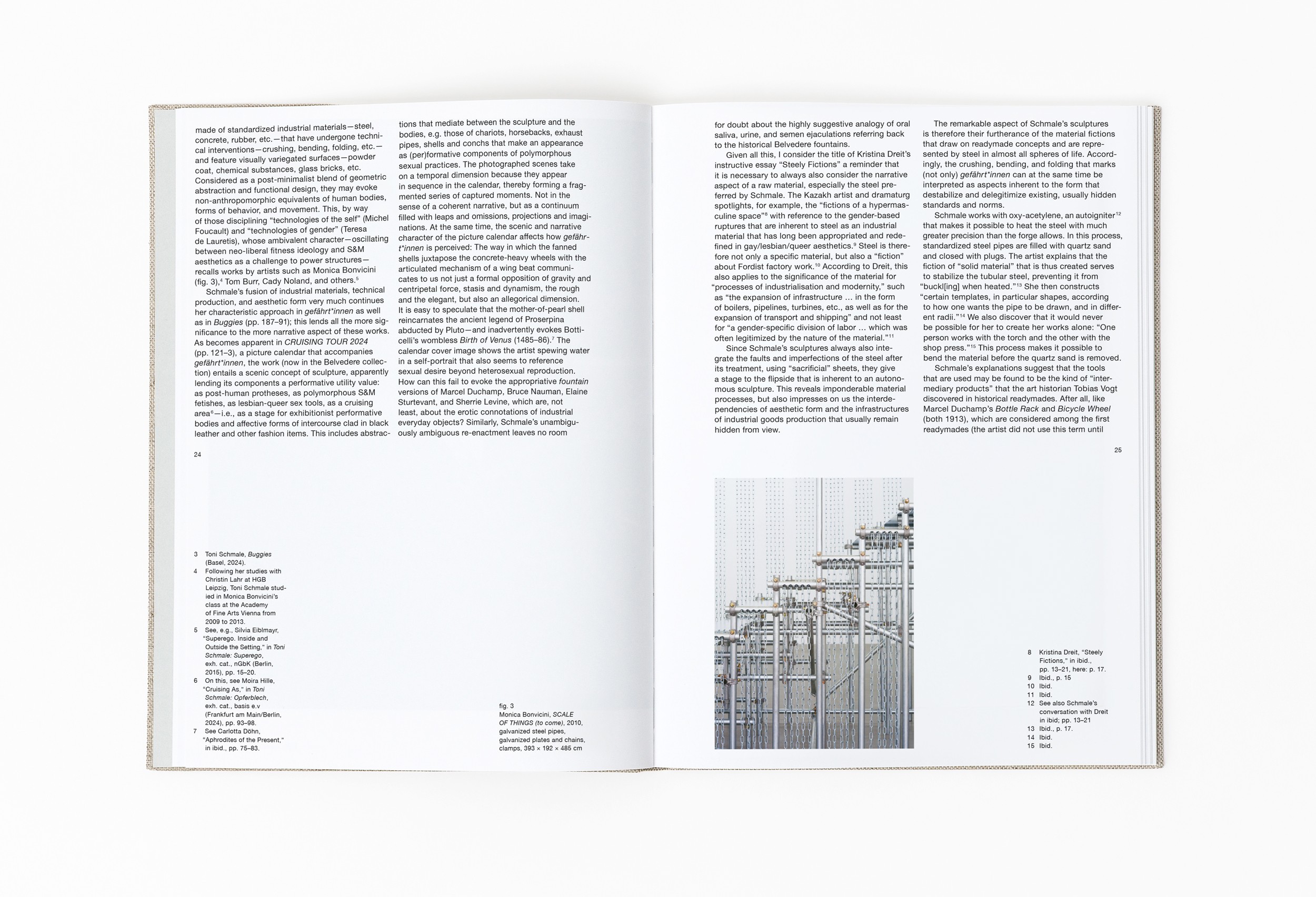This publication is the first comprehensive overview of the sculptural and performative work of artist Toni Schmale, whose practice explores the intersections of body, matter, and power structures. Engaging with industrial techniques and materials, Schmale investigates the relationship between physical and non-physical environments and challenges conventional perceptions of space, social power relations, and gender identification.
